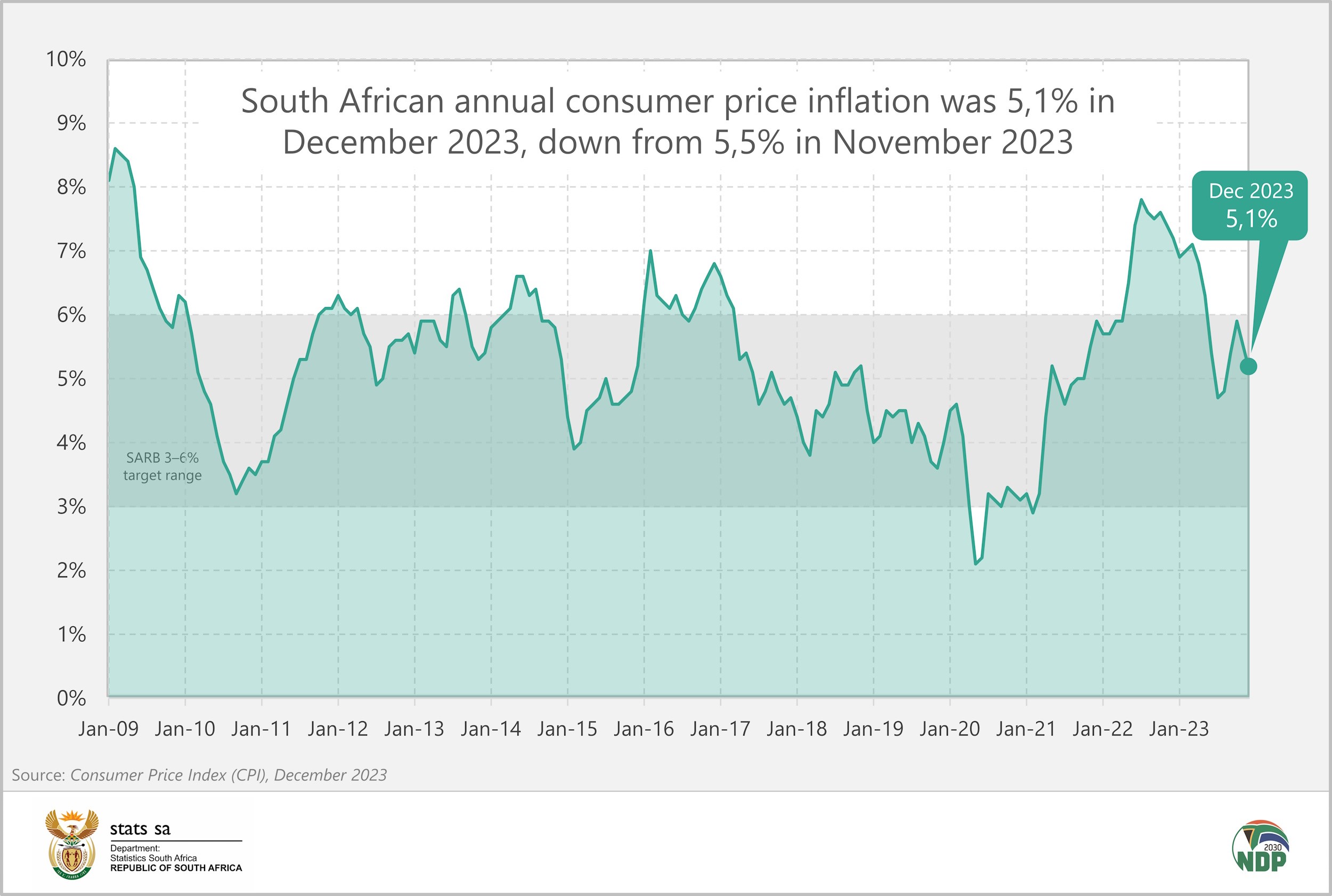 Annual consumer price inflation pulled back in december, easing to 5,1% from 5,5% in november and 5,9% in.